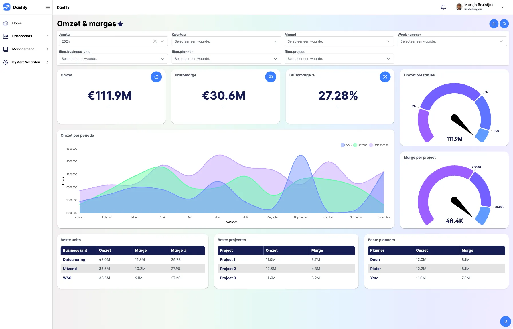 Stop met achter de feiten aanlopen en begin met vooruit plannen met real-time stuurinformatie. Dashly helpt je tijd besparen door handmatige dataverzameling te elimineren en teams actief te laten meedenken op basis van actuele cijfers. Voorspel trends, stel de juiste KPI’s in en stuur bij op basis van data in plaats van onderbuikgevoel. Zo werk je proactief en strategisch, in plaats van reactief.